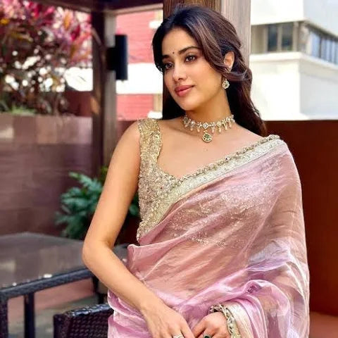 Janhvi Kapoor Inspired Pink Tissue Silk Lace Work Banarasi Saree