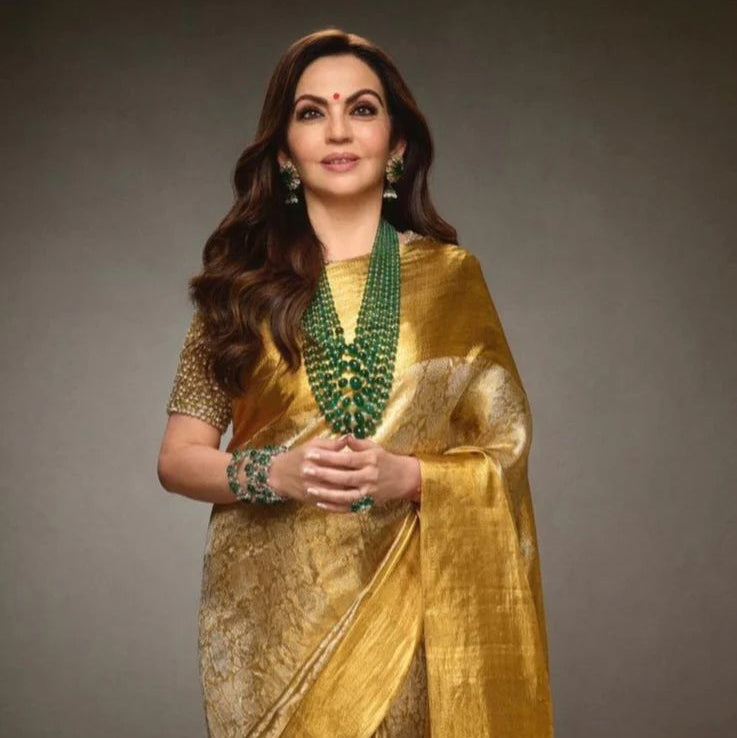 Nita Ambani Mam Golden Embossed Tissue Silk Saree